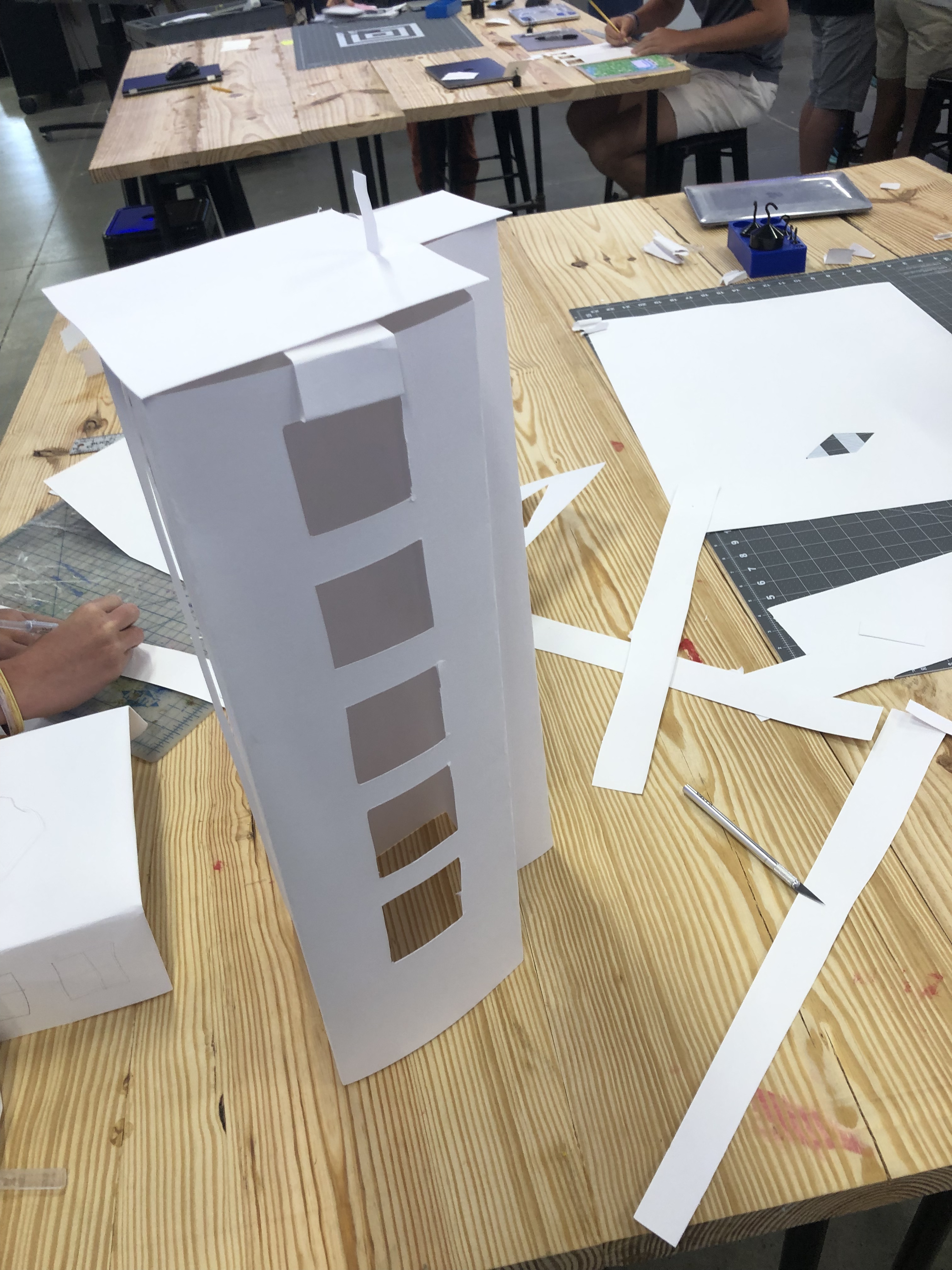 At first, I wasn’t sure what I was making but then I realized it looks like a mask so that’s what I went for. Next, our assignment was to make something out of just paper that was 10 inches tall and could support a 1lb weight, I made this: