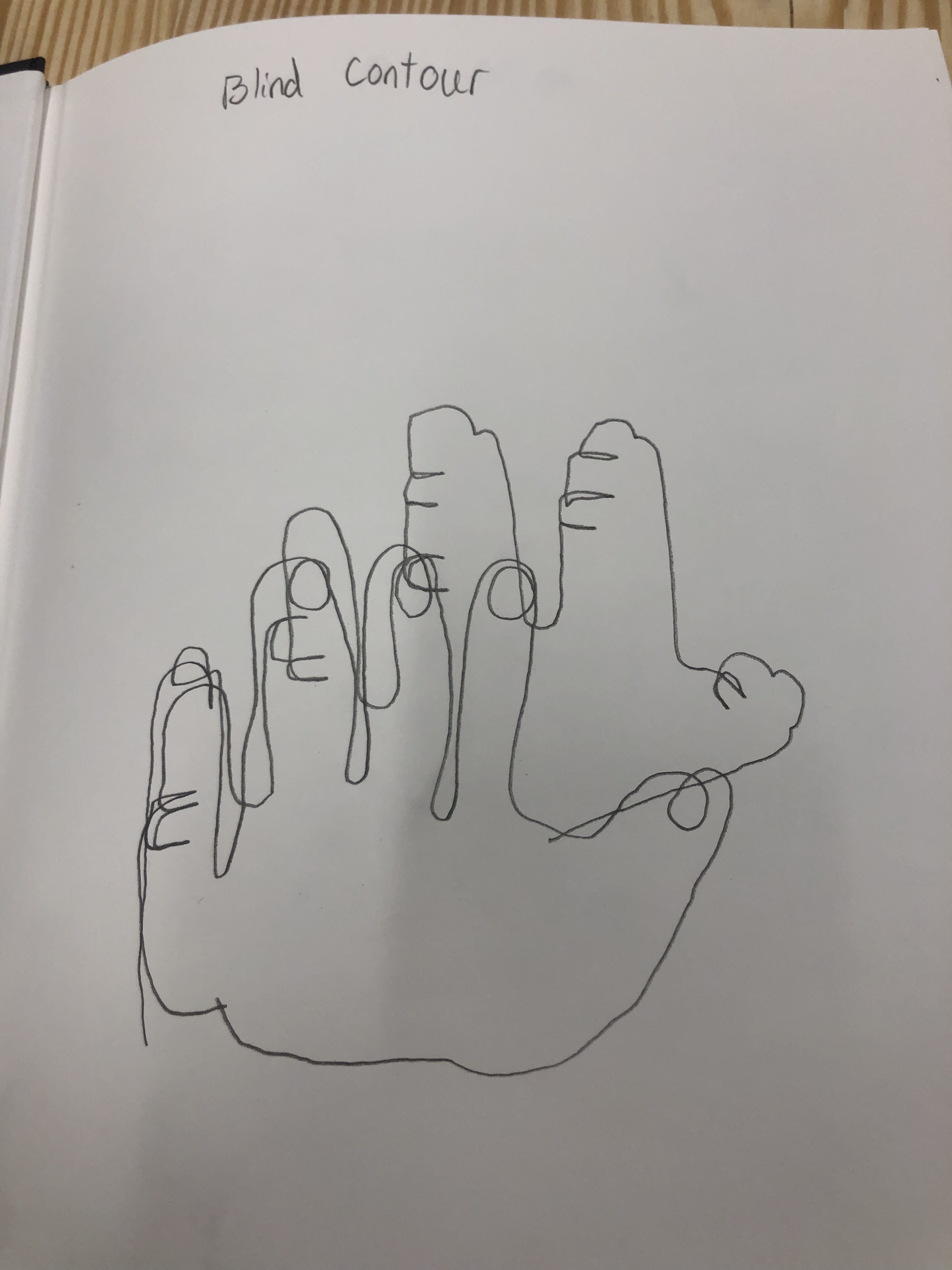 On the next day we did some sketchbook drawings so the we could get used to drawing things around us. We did a blind contour of our hand, then a regular drawing of our hand, and finally some objects that we had at our tables.