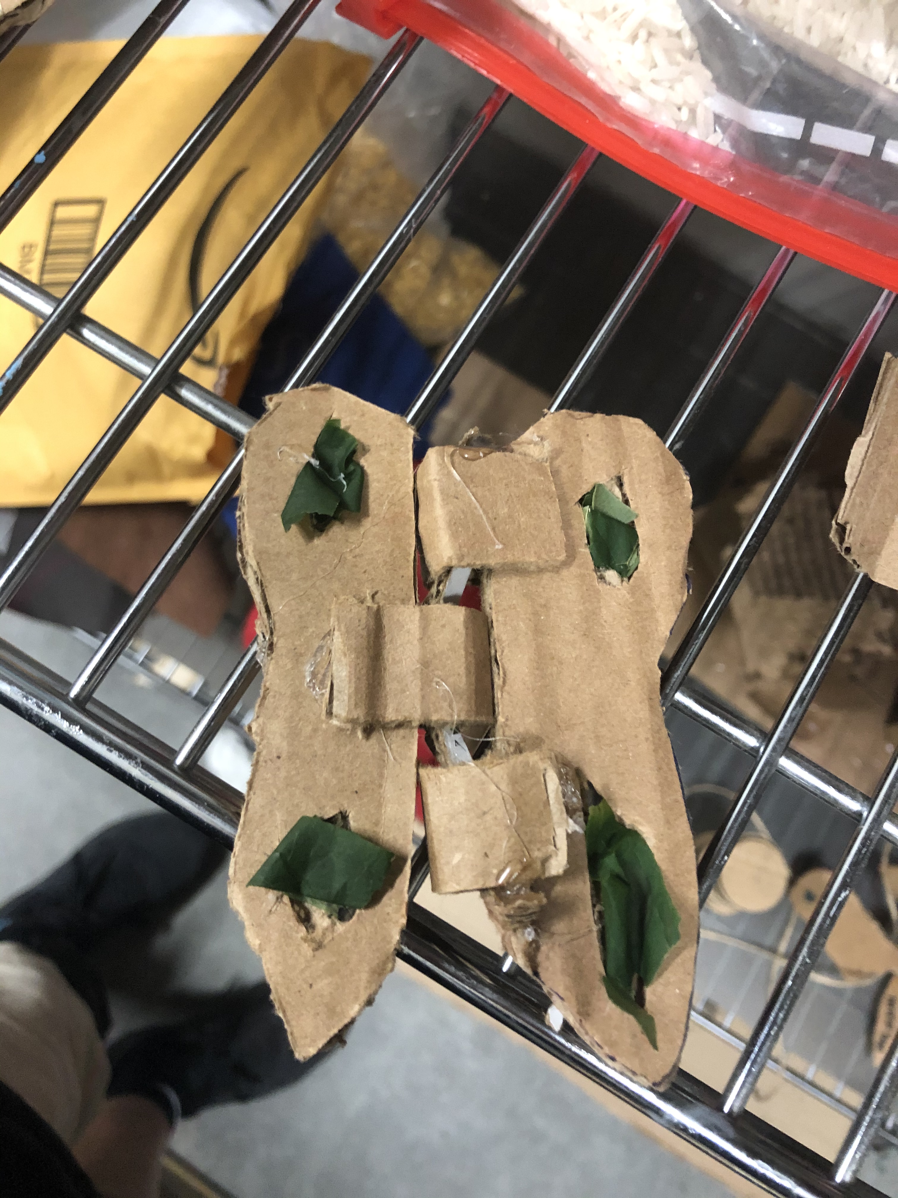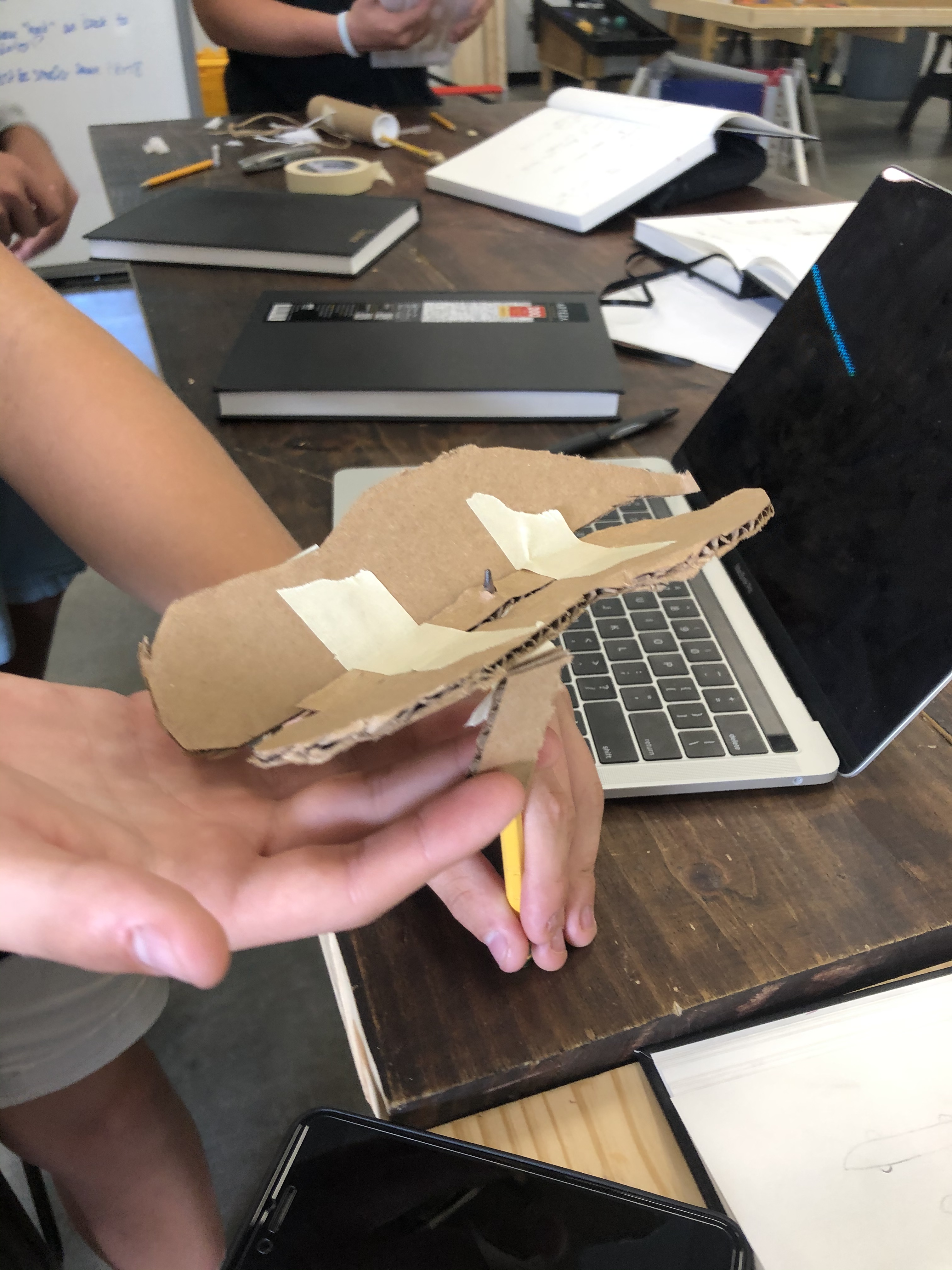 In our next class, we created the next prototype. In this one, we created a hinge that the wings were attached to them we had 2 pieces of cardboard coming down.