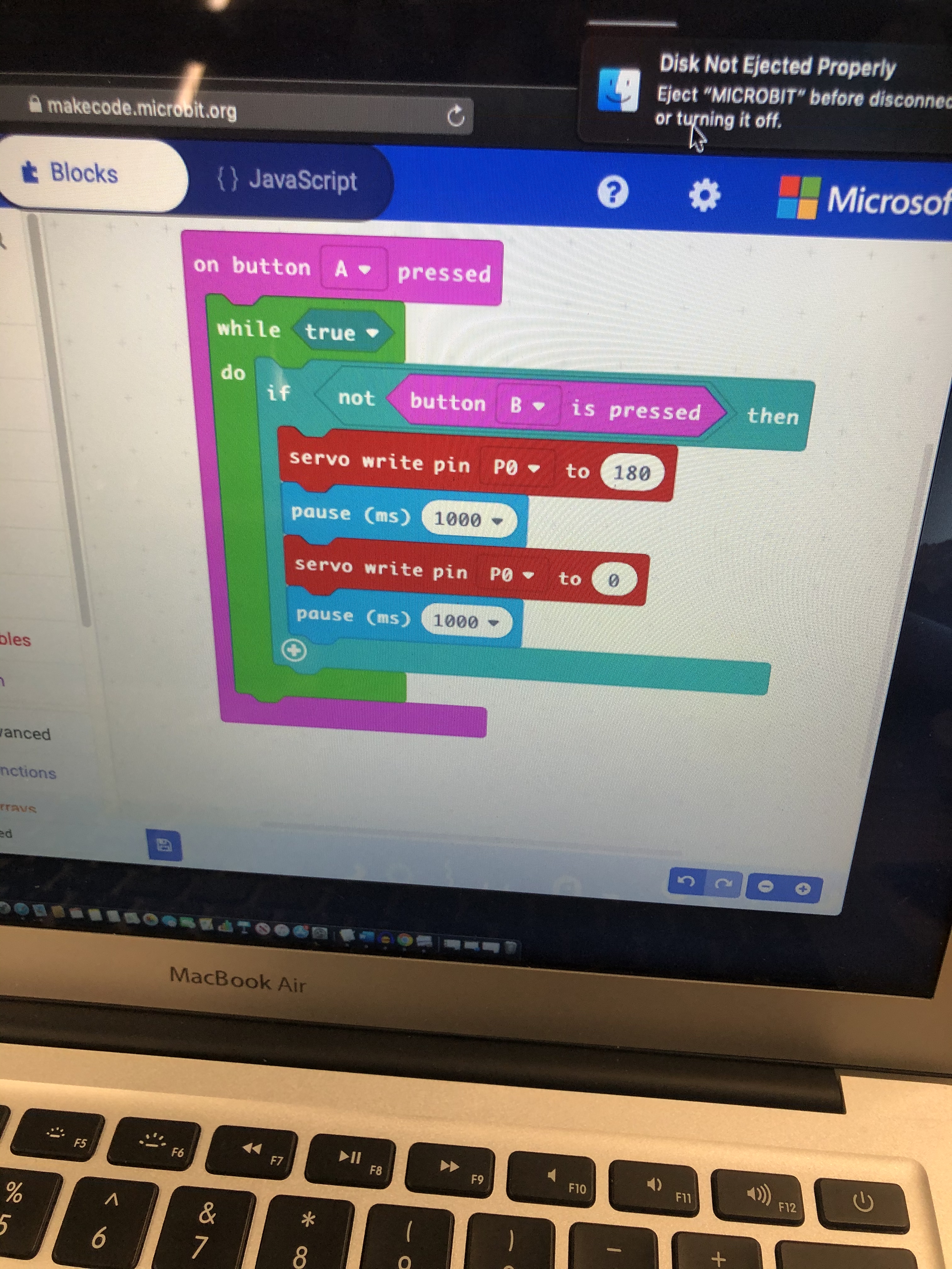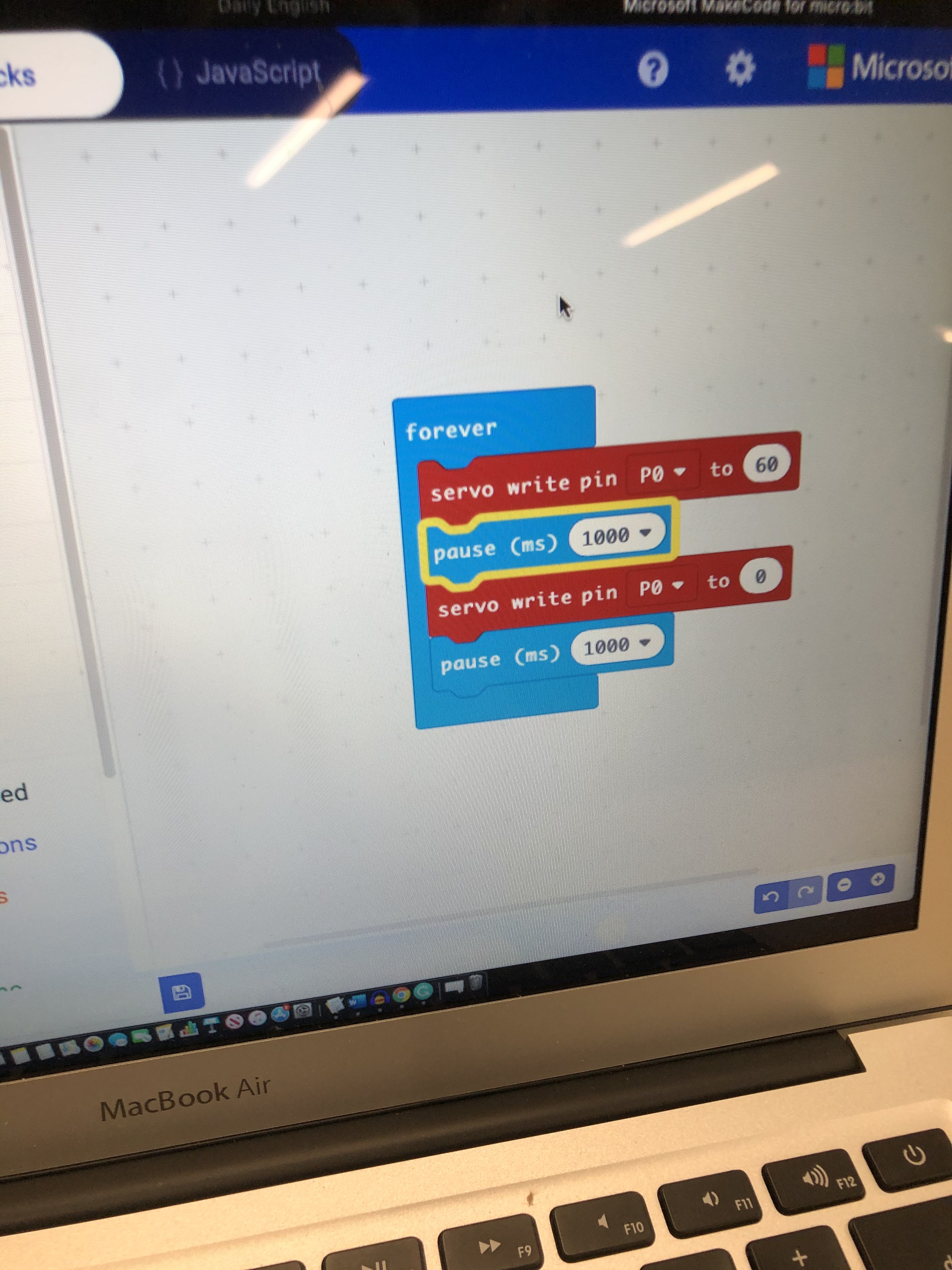 Today, we did block coding with micro bits. We connected a servo and I made a code that made it so when I press button “A” it would go 180° then back to 0° but when I hold down button “B” it stops. I really enjoyed this and I think we are going to use it on our project. This is where we show craft, when we planned to make the butterfly, we had a general idea of how we wanted to make the wings move. This turned out to be harder than I had anticipated, so when we did coding with the servos it was perfect. We got to combine a new thing that we had just learned with our project.