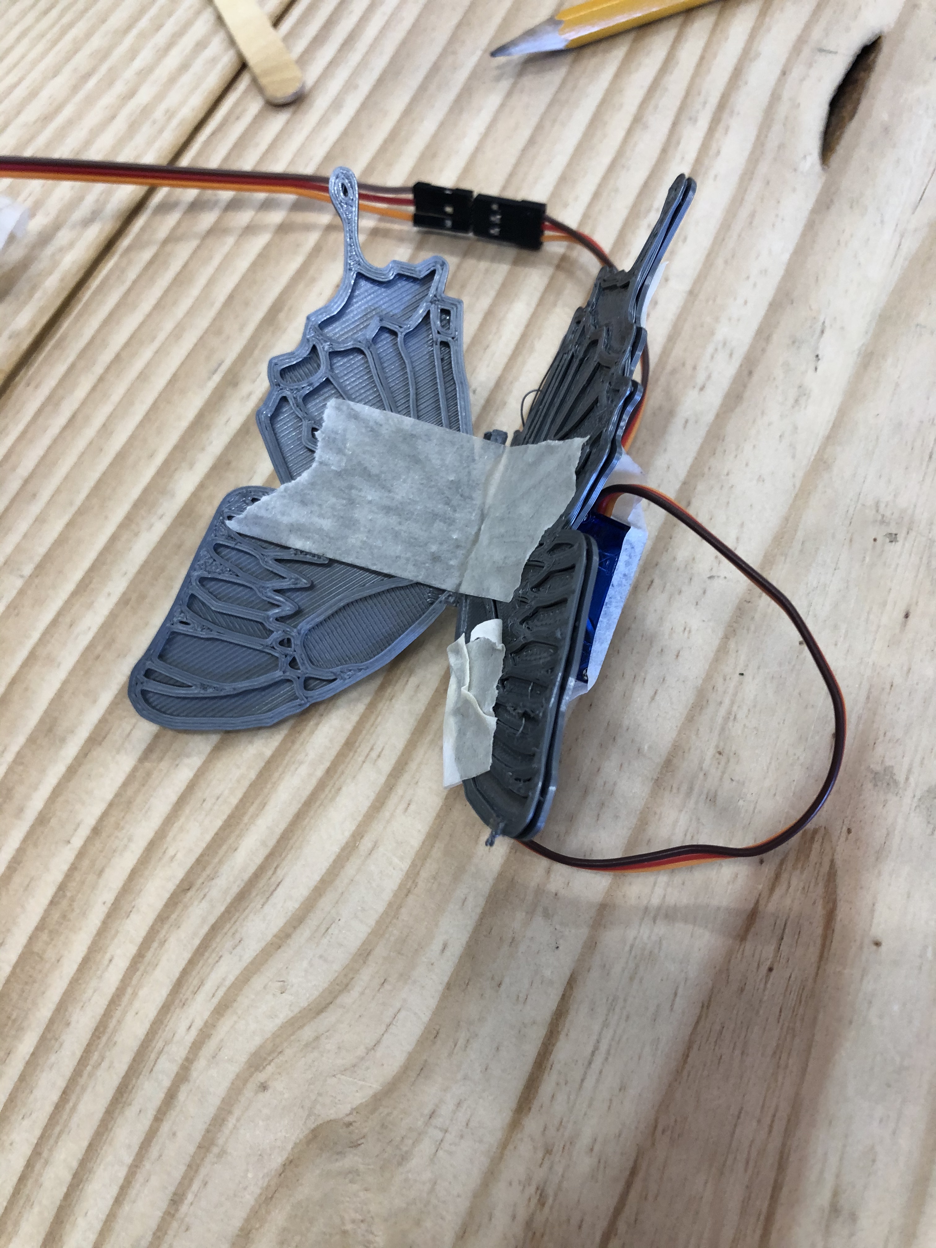 Yesterday I created a code that would work for the butterfly. I also figured out how we were going to make the wings flap by mounting on wing and having the other move. By testing it, and showing Mush, he gave me feedback on how I could make one wind move and mount the servo to the other wing. This made the whole thing run smoothly.