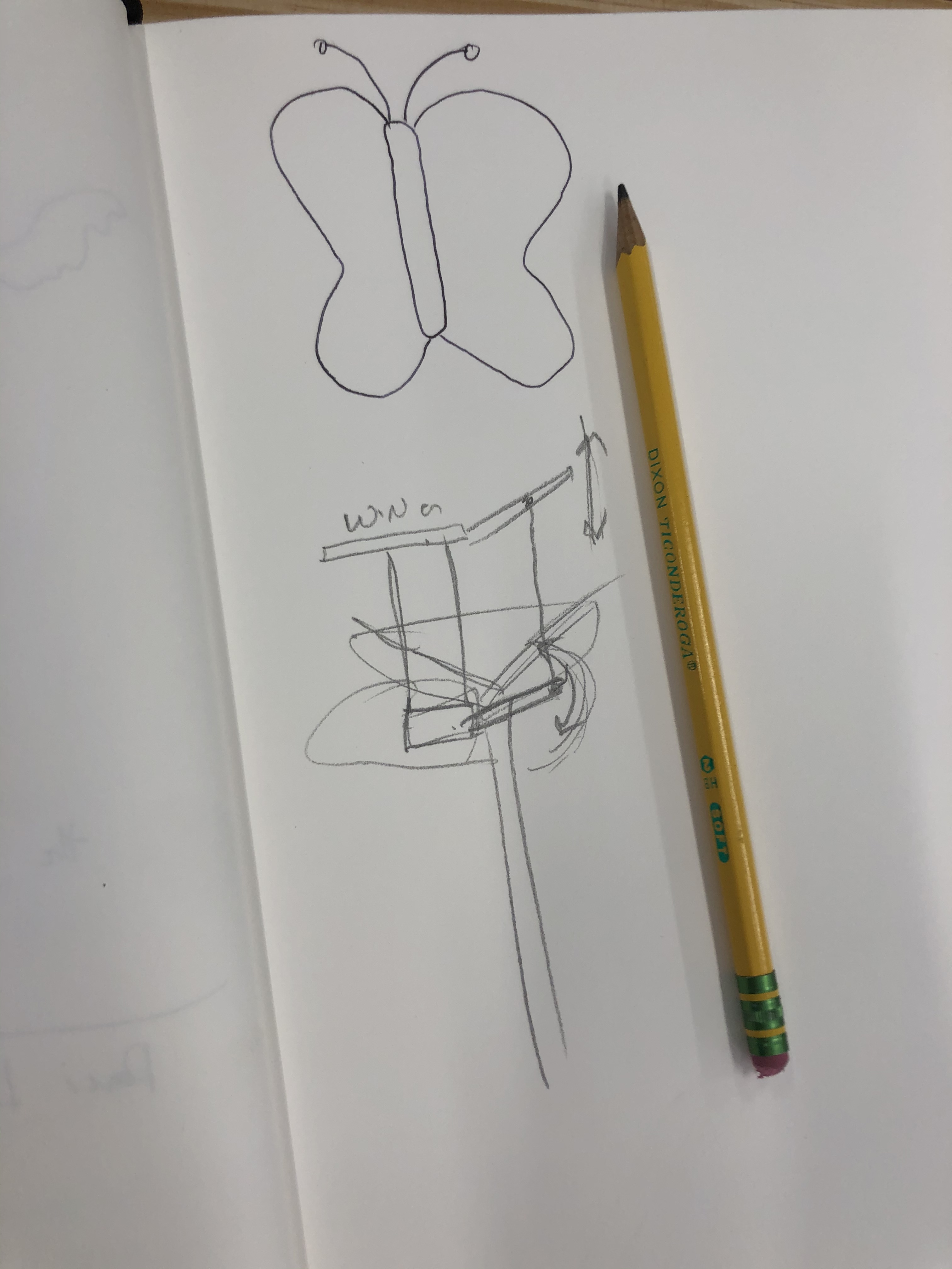 Today Alex and I did some planning for our project, we settled on making a butterfly that’s wings would flap when cranked by a handle. Then we made a project proposal in our sketchbooks. We are going to 3D print the butterfly body. We innovated by seeing a butterfly in the presentation that Mush showed us. We liked that it was simple and also detailed. In ours, the wings will move connected to a servo, but in the one in the video they were connected to gears. Also, our butterfly will be resting on a flower. For the design, I wasn’t sure what material I wanted to use. I haven’t really 3d printed anything, but Alex was enthusiastic about it and knew how to do it.