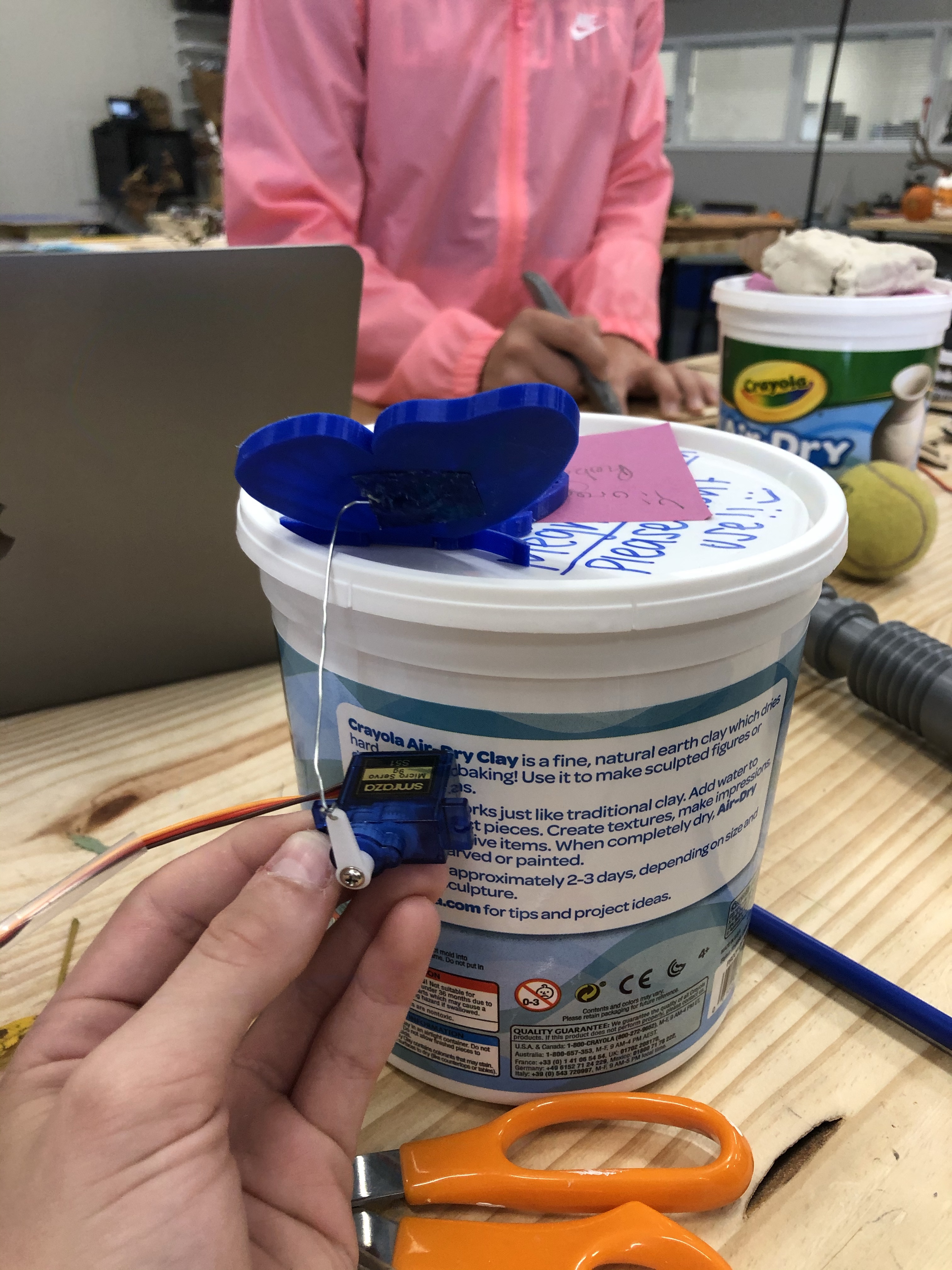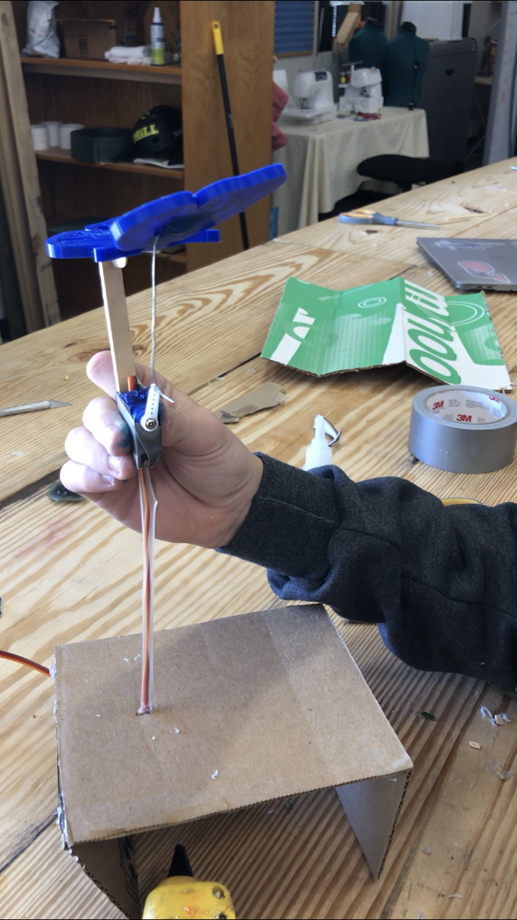 Today I started class off by making a more advanced code. This one made the timing better, and allowed us to start and stop it by pressing the A or B button. Then we used the 3d butterfly that we tried to print and failed. We then made the decision to cover the servo with a flower and have the wires run through a straw.