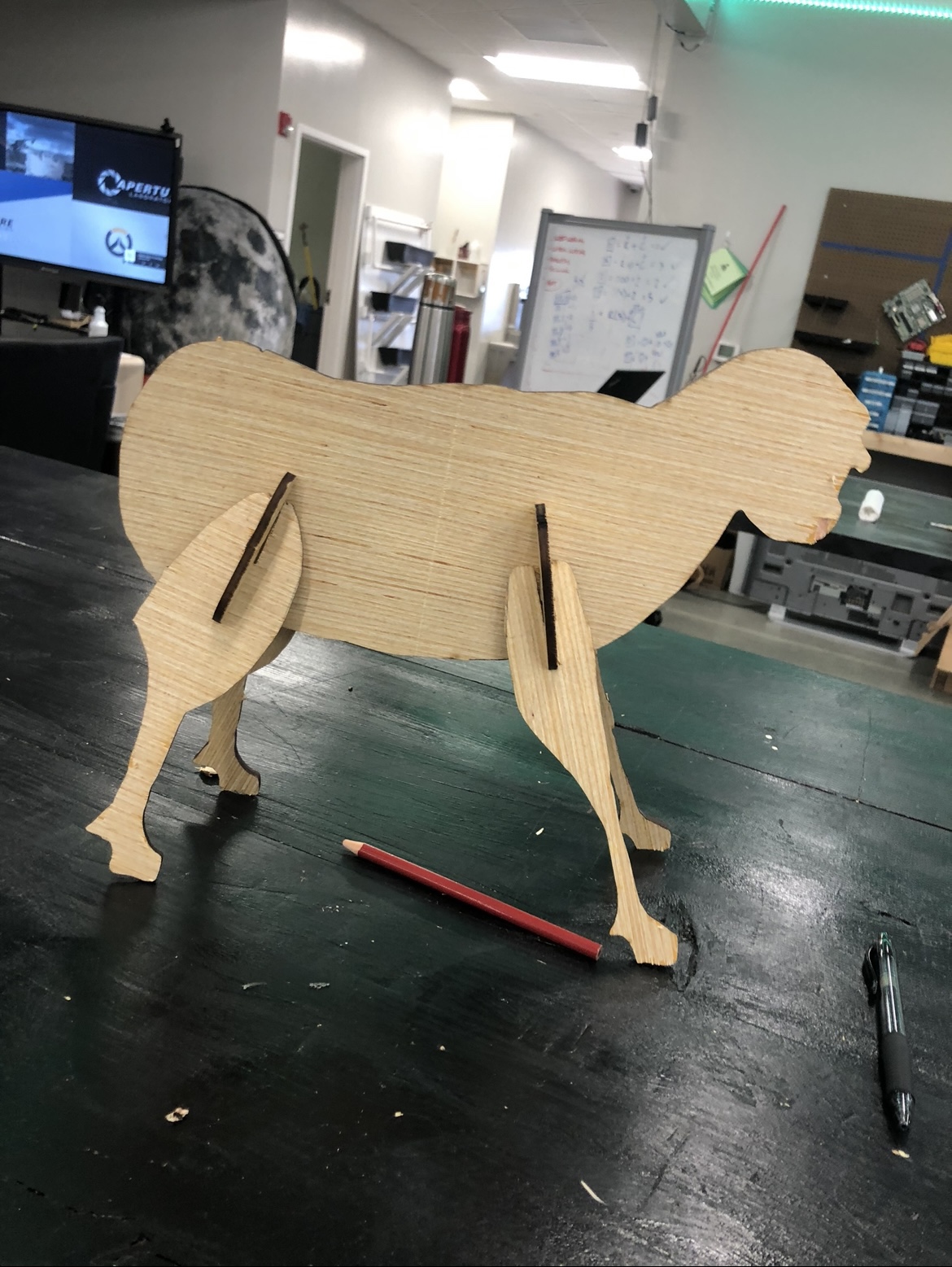 We then arranged them in a way that we wouldn’t need more than one sheet of wood. After it was all cut out we glued the pieces in. This is the final prototype: